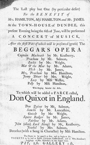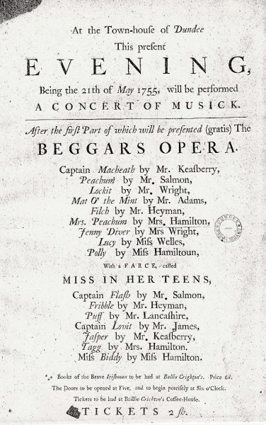 Dundee's Theatre Royal would not be built until 1810, so at other premises and under other conditions, a visiting company would customarily charge entry for a short 'Concert of Musick' after which would be performed 'Gratis and for Nothing' a play or two. Regulation, then as now, could often be worked round.