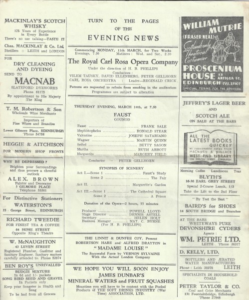 Cast details for Faust are from a programme for 14 March in the OperaScotland collection and for 29 March in Aberdeen City Library.